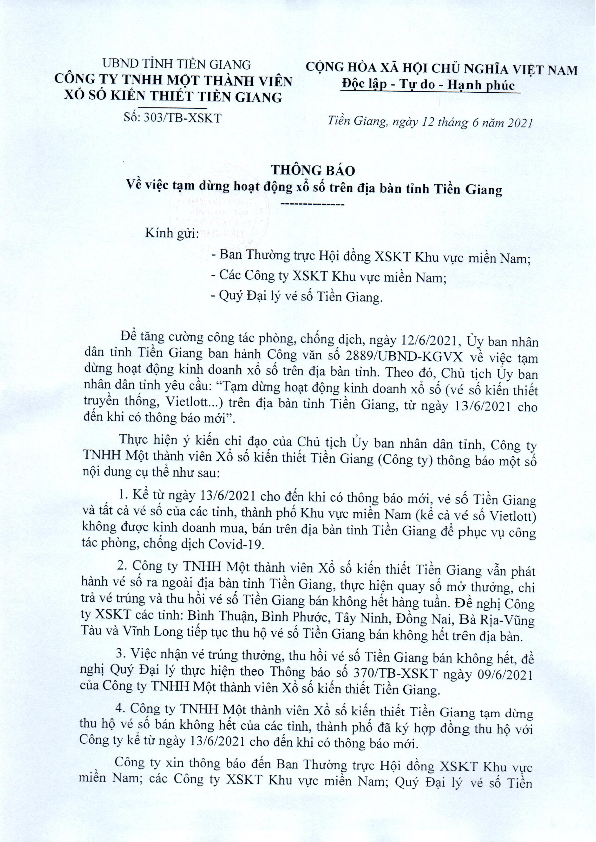 Thông báo Về việc tạm dừng hoạt động xổ số trên địa bàn tỉnh Tiền Giang