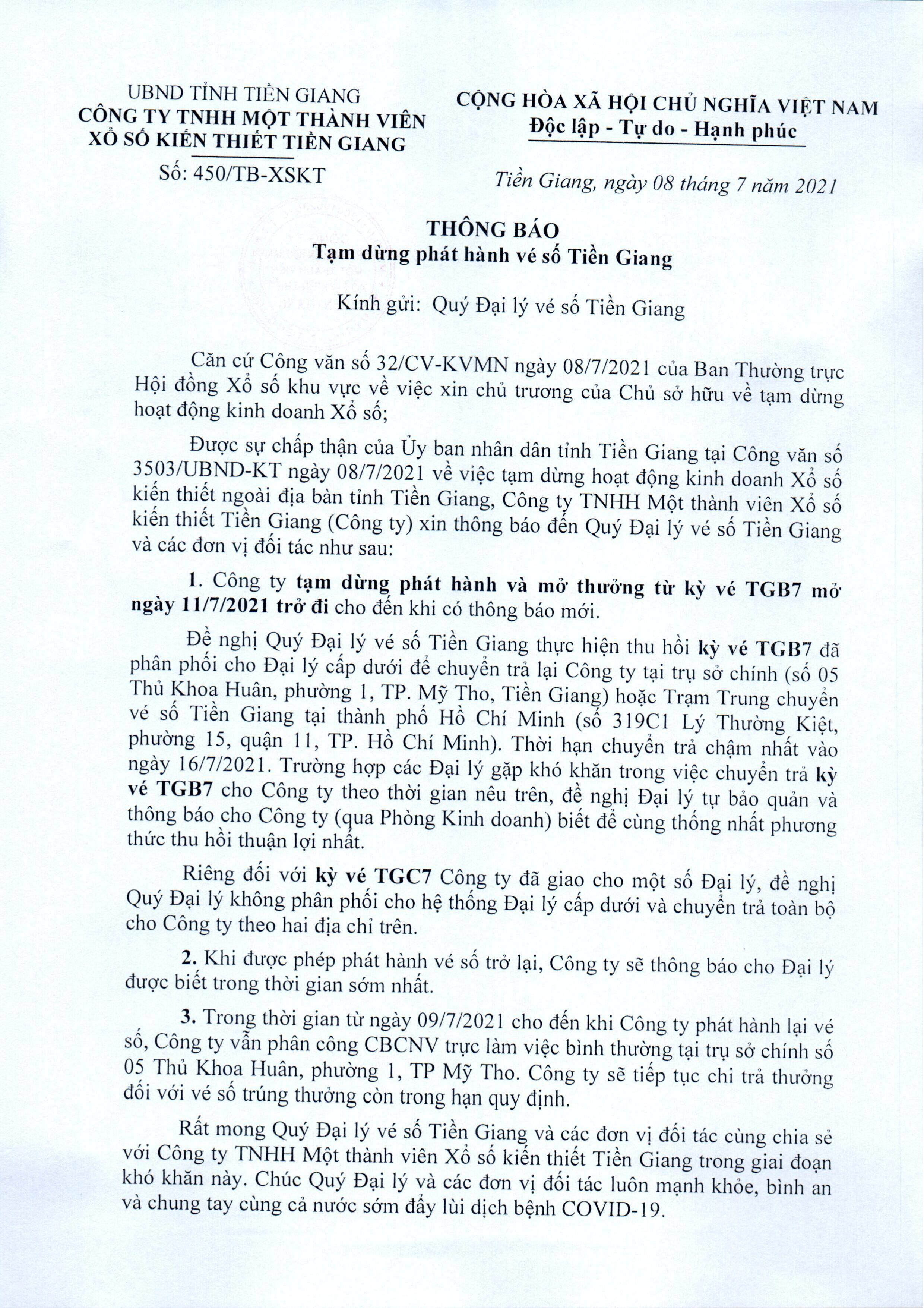 Tạm dừng phát hành và mở thưởng Xổ số kiến thiết Tiền Giang chung tay phòng, chống dịch Covid-19